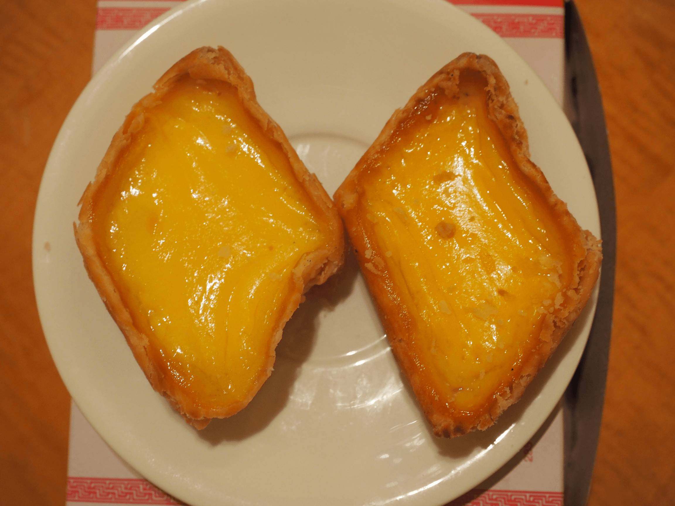 TongHeng_EggcakesWe were not quite sure what to expect since we knew combinations like salted egg yolk and lostus paste from mooncakes. And since Chinese seem to have a very creative approach to the notion of ‘cake’ or ‘tart’ we half expected some savoury piece of pork inside. But no, these egg tarts were indeed a pastry and they were rather nice. The inside was sweet and soft, the shortcrust brittle and slightly salted, which gave a nice contrast.